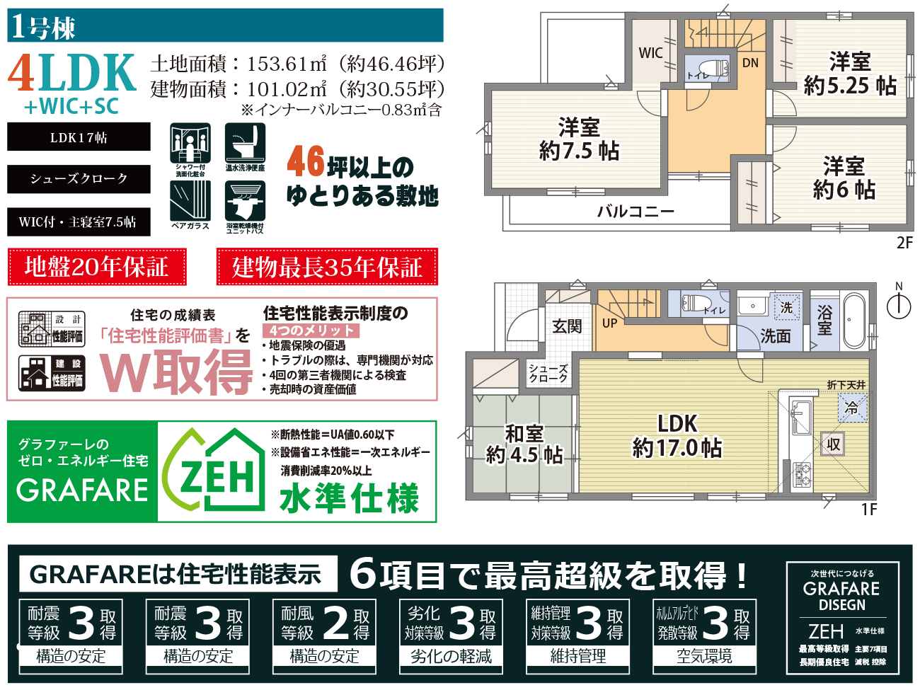 2025年12月1日(月)~2026年3月15日(日)までにご契約いただいたお客様限定のキャンペーンです。 ※表示価格の満額でご契約いただいたお客様対象です。 ※お引渡し後の施工・設置となります。 https://www.tacthome.co.jp/grafare/refa-suigen-campaign/ ■LDK17帖 ■シューズクローク ■WIC付・主寝室7.5帖 ■全居室収納完備 ※建物面積101.02㎡ インナーバルコニー0.83㎡含む |